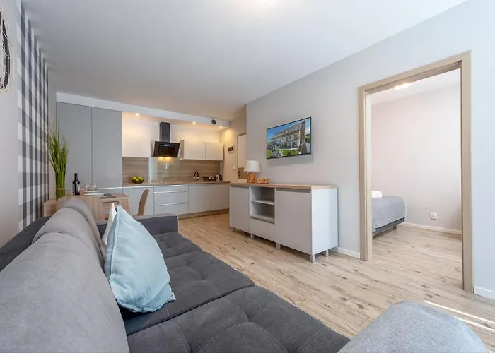 Апартаменты обладают кухней, оснащенной электрочайником, холодильником и стеклянной посудой. За 12 минут можно дойти до ресторана Smazalnia Ryb Atol и попробовать блюда польской кухни. В апартаментах можно воспользоваться аквапарком, верандой для загара и террасой для загара. Здесь есть возможность попробовать пешие прогулки, прогулки на лошадях и боулинг.